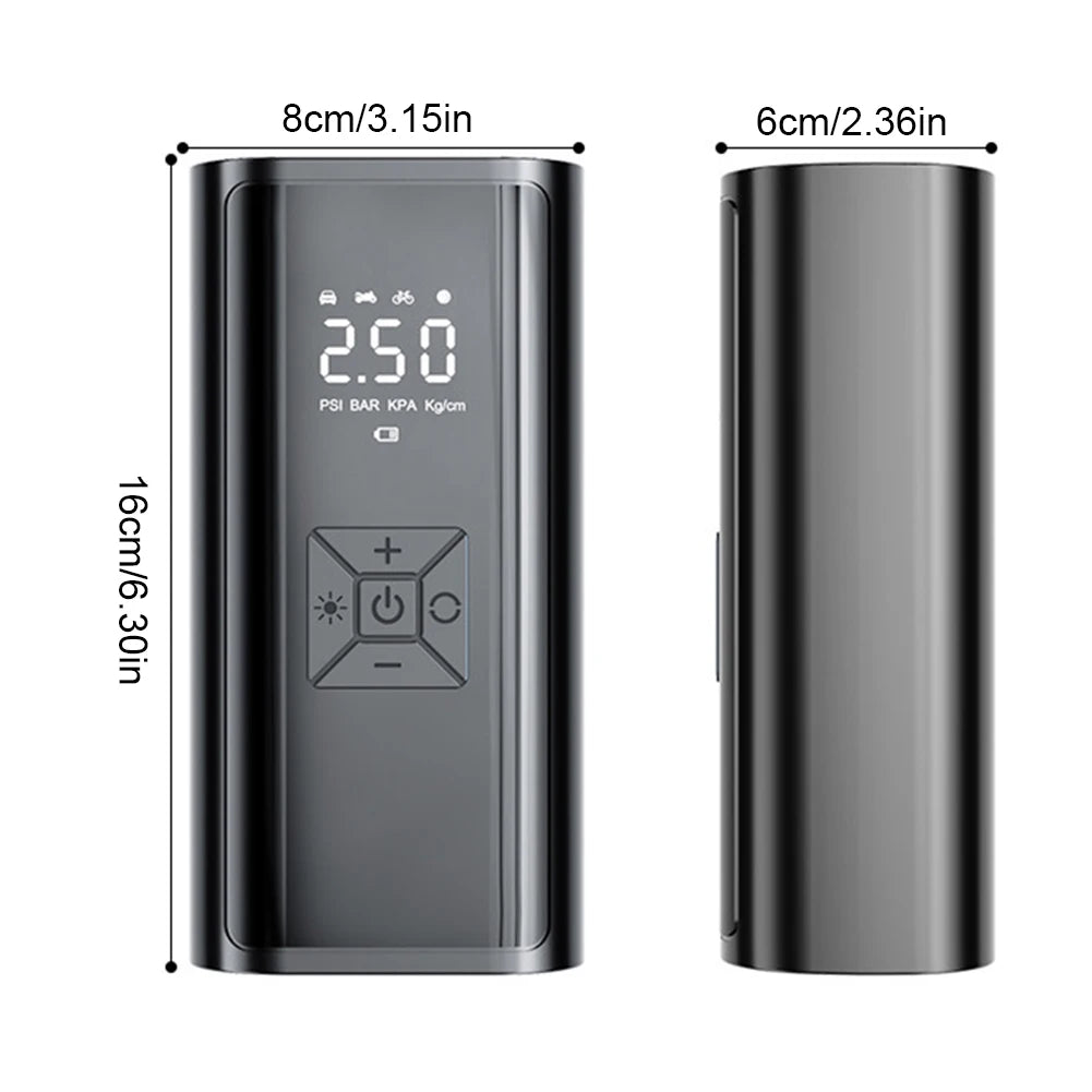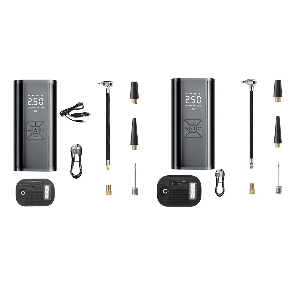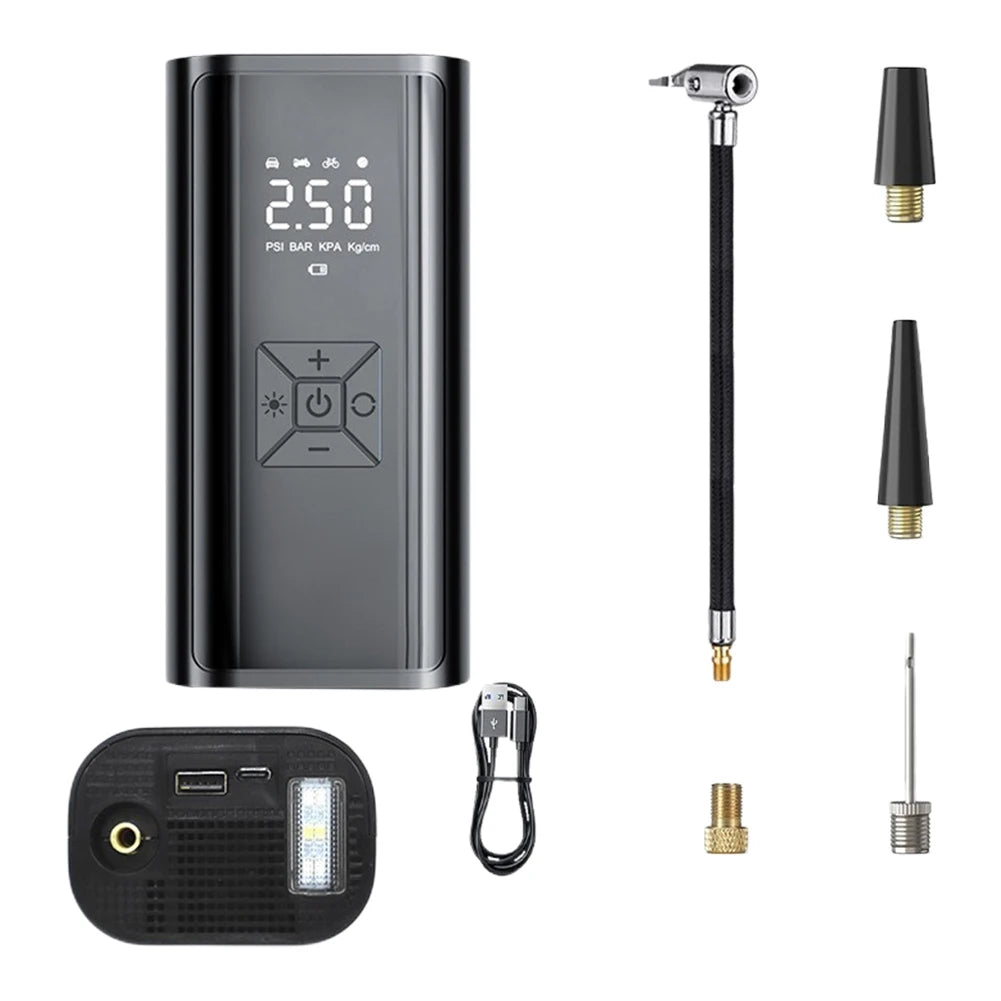 5. Versatile Design: Our wireless air compressor is not only an inflator, but also a rechargeable device that can be used for charging at home, in the car and in other situations. Also, different air nozzles are available to meet the inflation needs of different scenarios, such as cars, balls, bicycles, motorbikes, boats, etc. This design can provide you with more possibilities of use.
