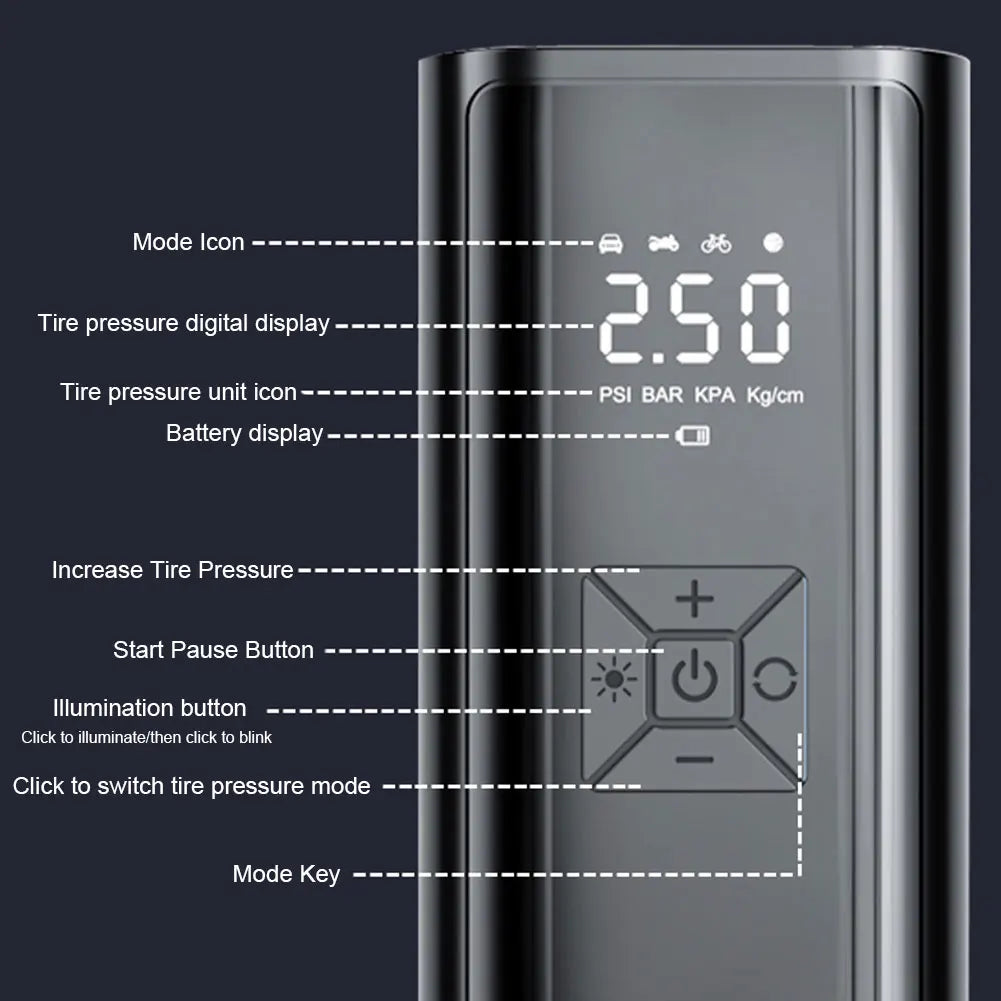 3. Convenient Night Operation: Our smart air compressor has been upgraded with full button backlighting and an LED light next to the operating buttons, which makes it easier to operate at night when the screen and buttons are switched on. This design allows you to operate the product conveniently in any environment.